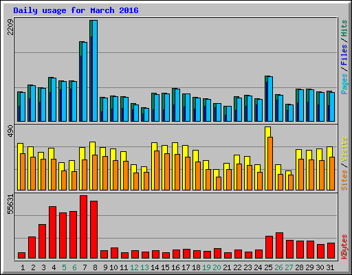 | Day | Hits | Files | Pages | Visits | Sites | KBytes | ||||||