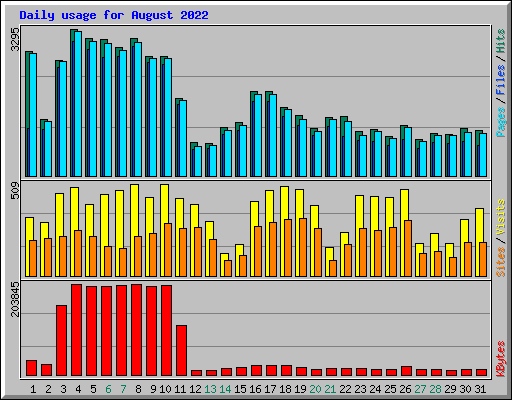 | Day | Hits | Files | Pages | Visits | Sites | KBytes | ||||||